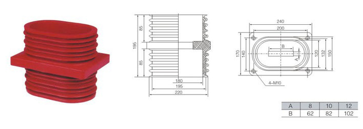 穿墻套管為環(huán)氧樹脂凝膠成型結(jié)構(gòu),外形結(jié)構(gòu)尺寸大小為170×240(140×200)mm、高195mm。主要適用于額定電壓為10KV及以下的 戶內(nèi)成套設(shè)備中,作絕緣隔離和聯(lián)接過(guò)度之用。套管耐污及潮濕,無(wú)需特別維護(hù),只需定期地清理表面污質(zhì)。安裝時(shí)母排從孔內(nèi)穿過(guò)。周圍環(huán)境溫度在+40℃~5℃之間;當(dāng)空氣溫度+20℃時(shí),相對(duì)濕度布超過(guò)85% 無(wú)嚴(yán)重影響觸頭盒絕緣的氣體、蒸汽、灰塵及其它爆炸性和腐蝕介質(zhì)的場(chǎng)所。