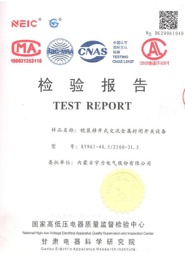 KYN61-40.5/2500-31.5鎧裝式開關柜(檢驗報告)